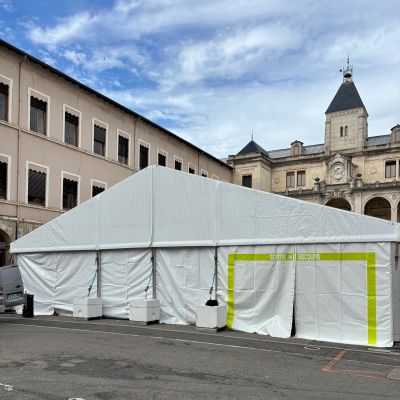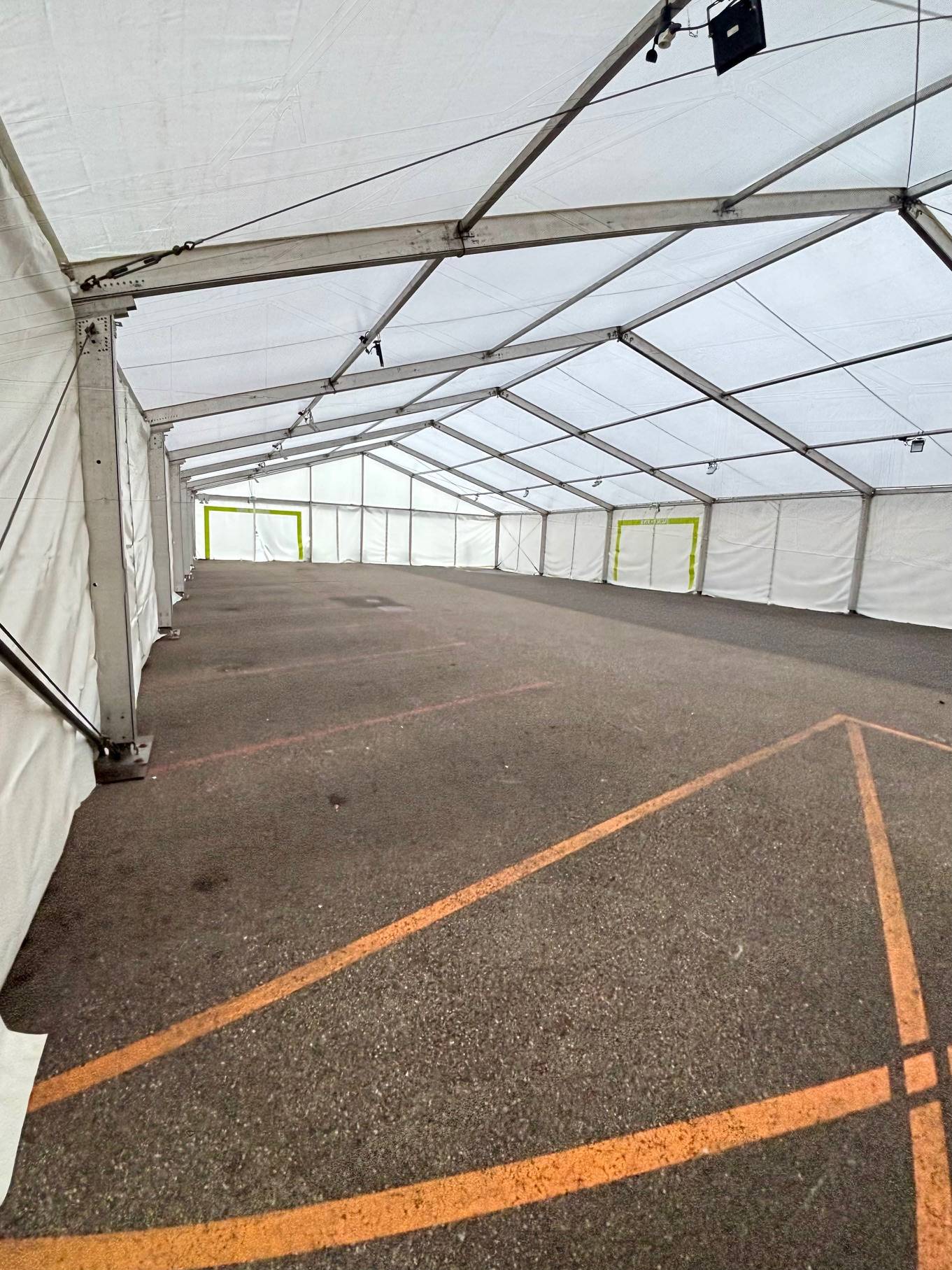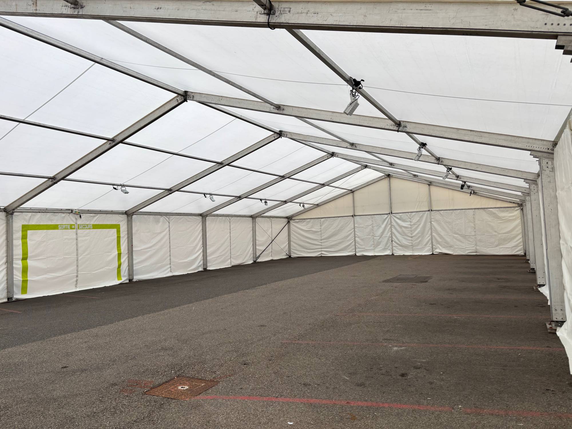 L’intérieur a été équipé d’un éclairage complet sous le toit du chapiteau, ainsi que de tous les dispositifs de sécurité ERP requis : blocs lumineux, portes de secours signalées et issues de secours accessibles.