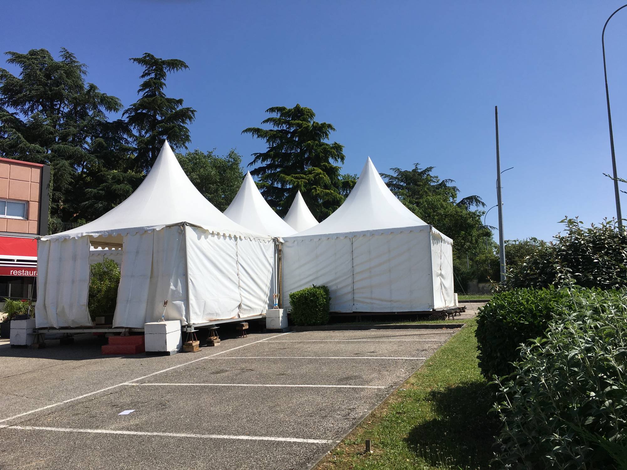 Nous vous proposons à la location des tentes événementielles conçues pour vos conférences de presse et vos réunions à Lyon. Leurs particularités ? L’entoilage. Ces tentes sont installées avec des bâches opaques toit et/ou murs. Cette bâche blanche en plastique est composée d’une fine pellicule noire incrustée empêchant la lumière de rentrer. Son avantage ? Combattre la chaleur et empêcher les rayons du soleil de passer.