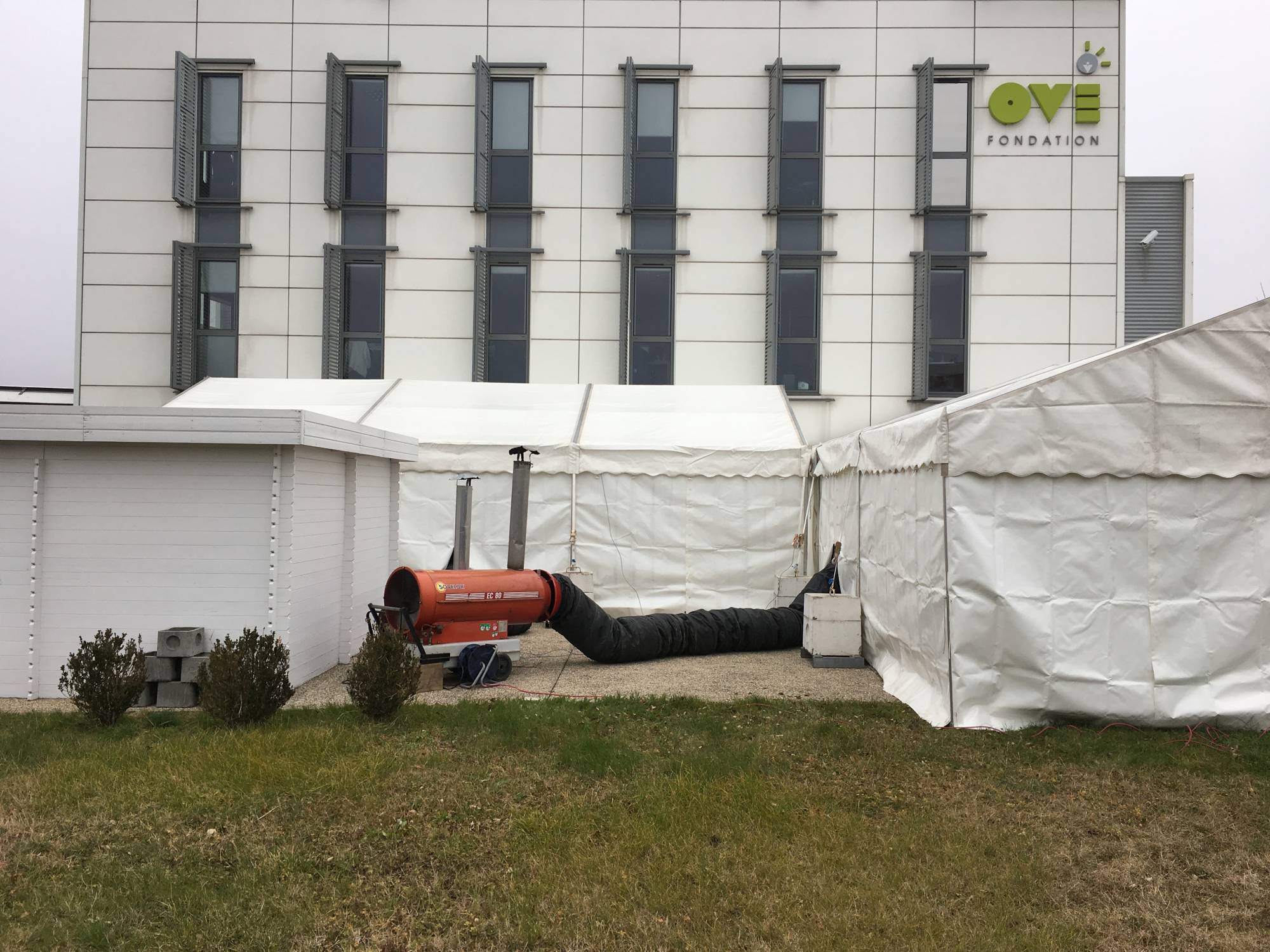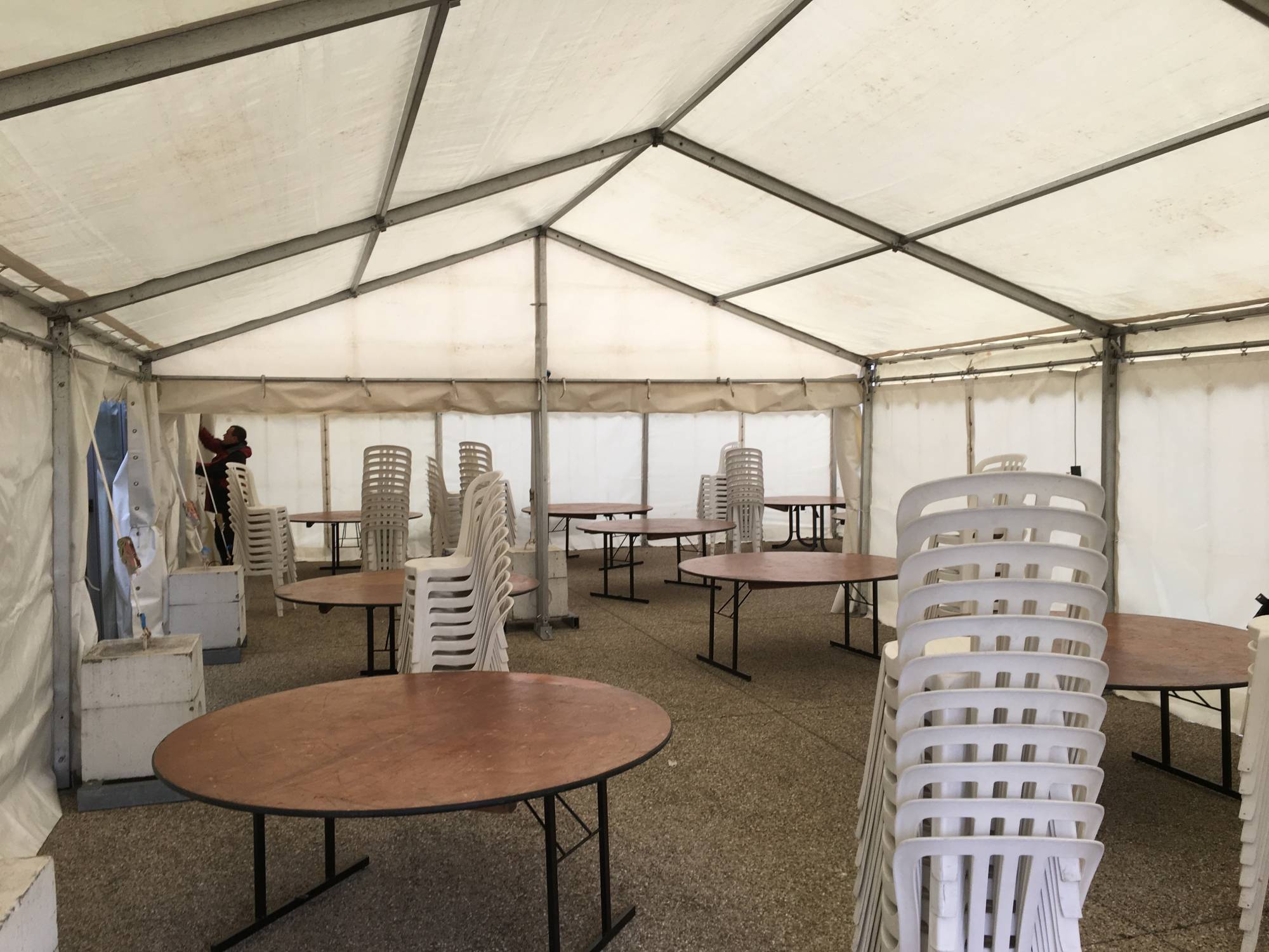 Chaque année, OVE organise sur ses espaces extérieurs une réunion interne et un repas assis. Pour cette occasion, Carcat Location a installé deux tentes. Une tente de 54m2 (6x9m) et une tente de 72m2 (6x12m). Ces tentes sont juxtaposées l’une à côté de l’autre pour former un espace de réception beaucoup plus important. Pour le repas assis, nous avons installé du mobilier (table ronde & chaise garden cottage)