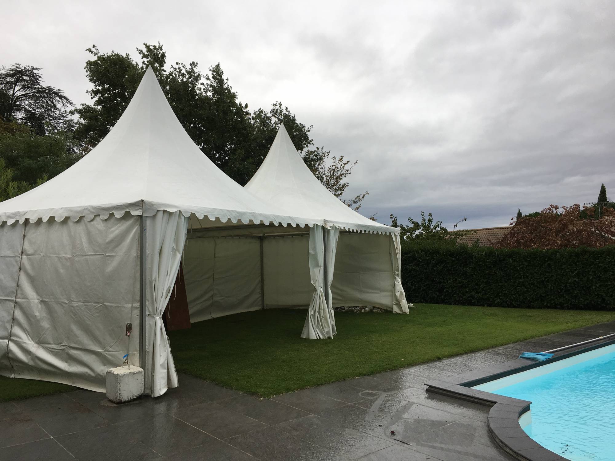 Deux tentes de 5x5 m (50 m² au total), positionnées face à la piscine, ont permis de créer un espace lounge confortable pour les invités, idéal pour se détendre durant la soirée.